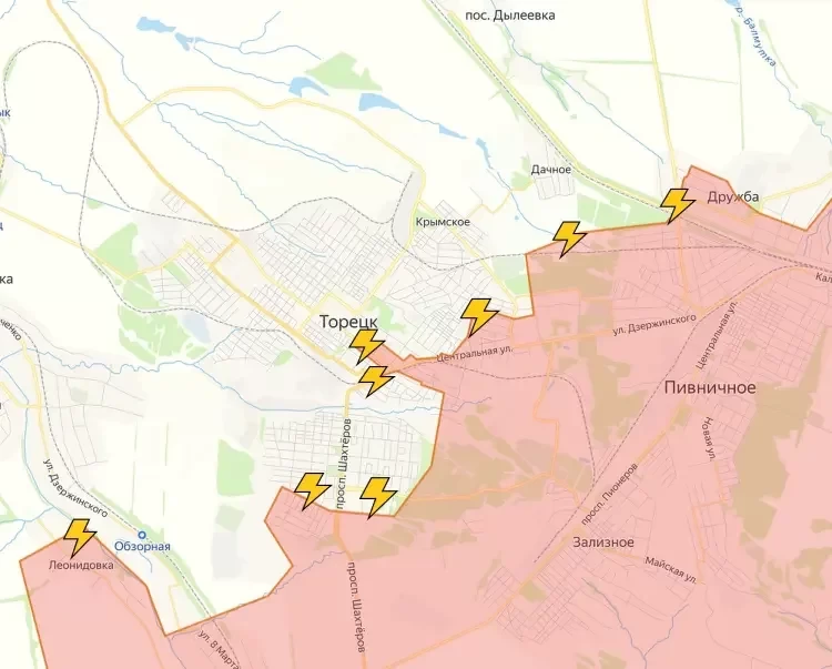 В самом Торецке (Дзержинске) российские подразделения предпринимают попытки продвинуться в районе улиц Дзержинского и Маяковского. Под контроль ВС РФ перешло здание бывшего ГАИ и прилежащие строения, по которым противник нанес несколько ударов БПЛА. Обстановка сложная, на участке продолжаются бои.