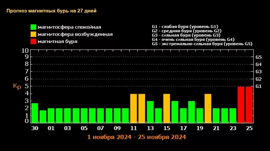 13 и 14 ноября будет небольшое затишье. 15 ноября прогнозируются солнечные вспышки, геоудары достигнут от четырех до пяти баллов, возможна магнитная буря. В период с 16 по 19 ноября магнитосфера будет спокойная, без потрясений.