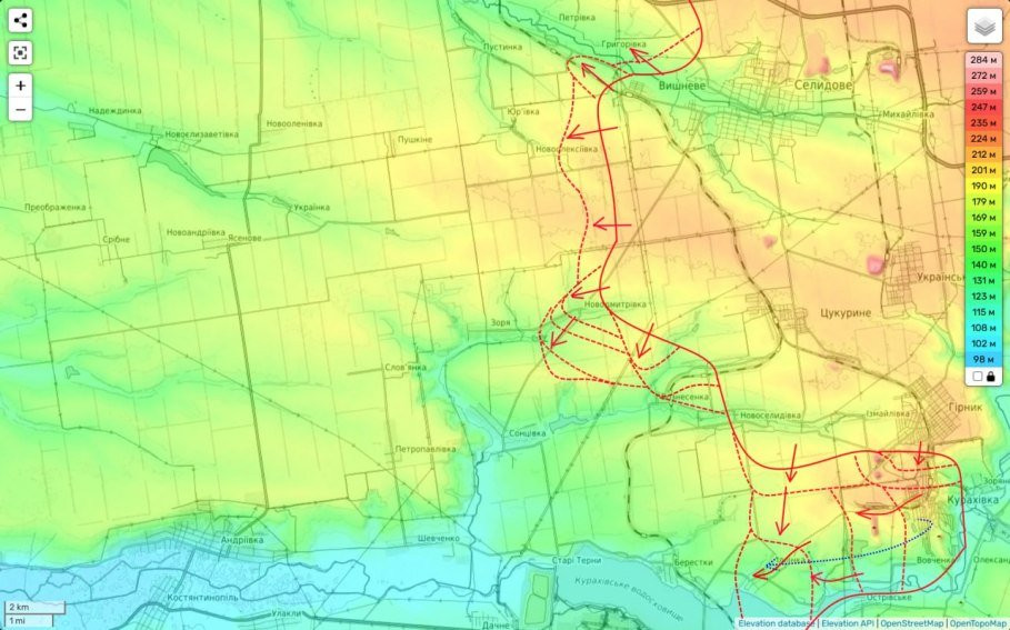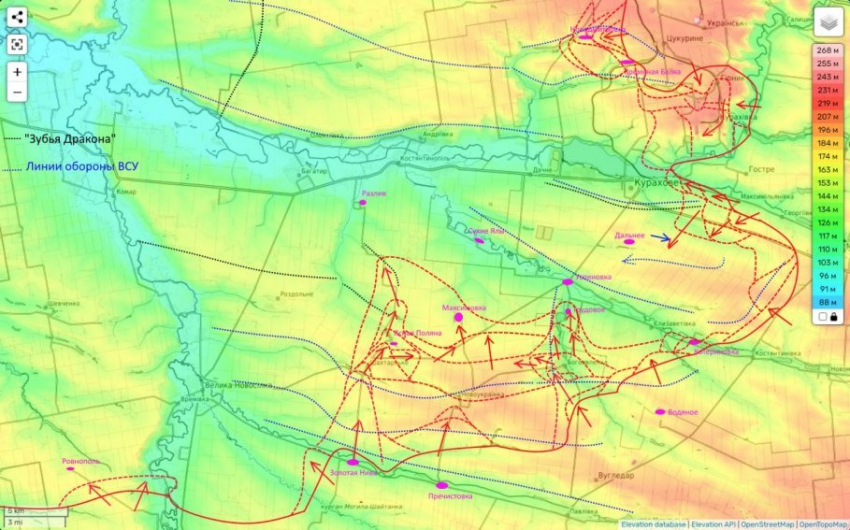При этом очевидно, что следующим таким рубежом должен стать рубеж Разлив - Сухие Ялы. От которого до реки Волчья останется буквально пара километров. И с которого мы сможем уже держать под огневым контролем трассу из Запорожья в Курахово.
