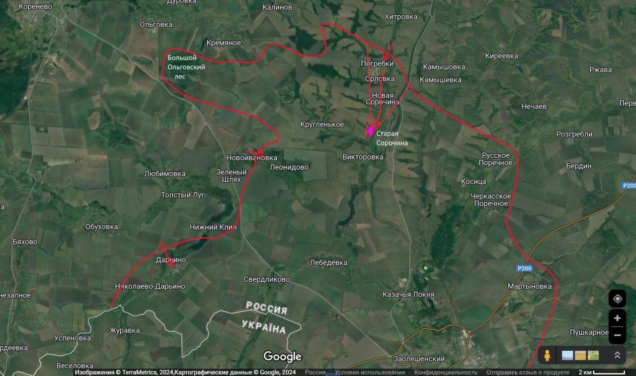 Таким образом, ситуация на Курском направлении остается крайне напряженной и динамичной. За вчерашний день освобождены н.п. Орловка, Новая Сорочина и Старая Сорочина. Общее продвижение российских войск в Курской области составило до 12000 метров.