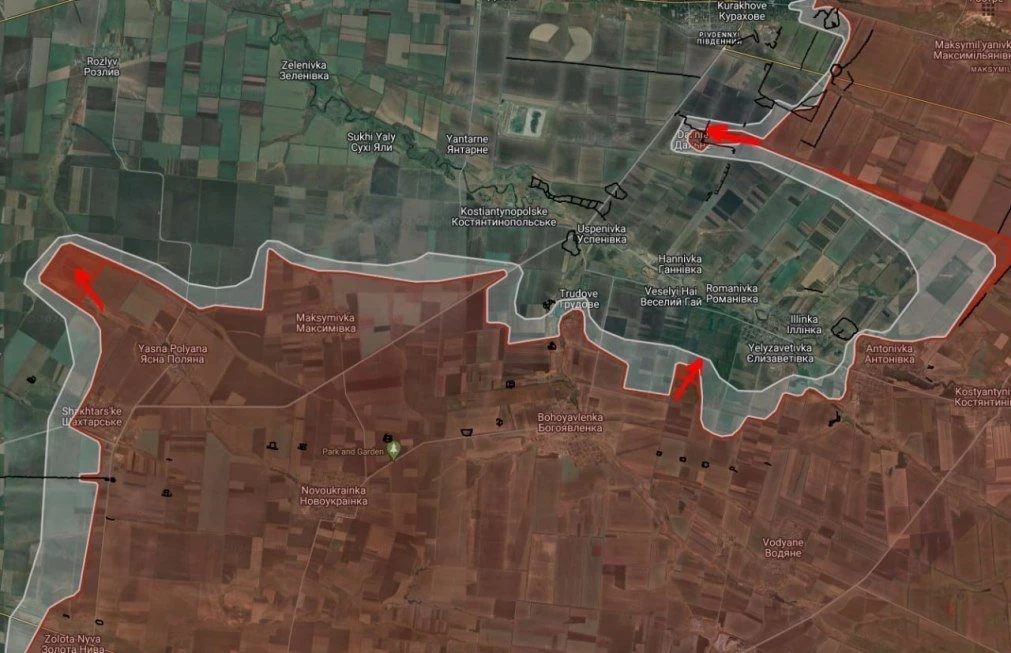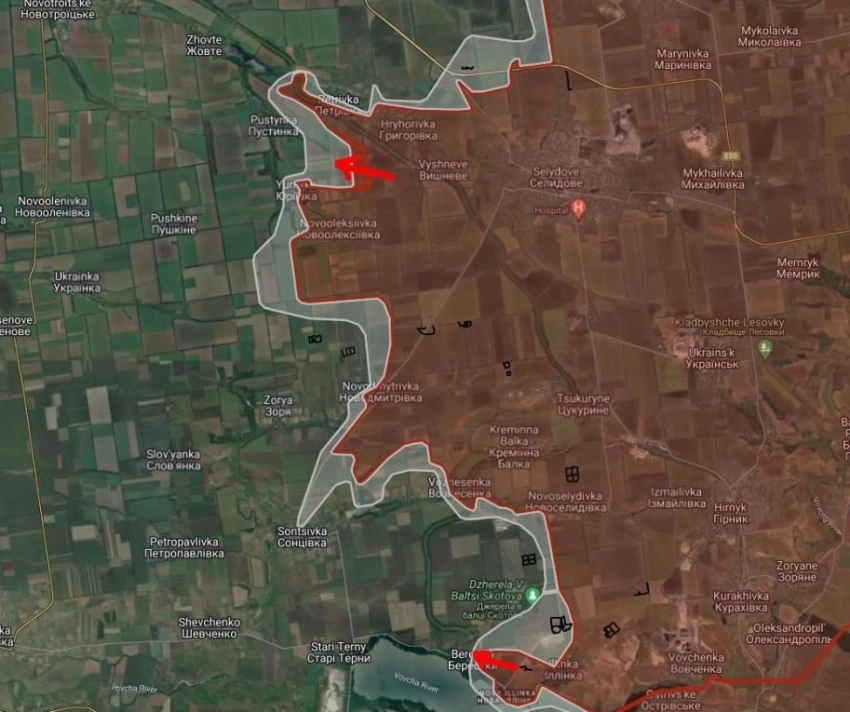 На Великоновосёлковском направлении на восточном участке ВС РФ продвинулись со стороны Ясной Поляны на северо-запад. Предположительно, тут у наших бойцов сразу две задачи: взять под свой контроль Раздольное и выйти на дорогу, ведущую к Великой Новосёловке в севера, а также обойти мощный укрепрайон, который располагается на трассе между Ясной Поляной и Разливом, и выйти к Разливу.