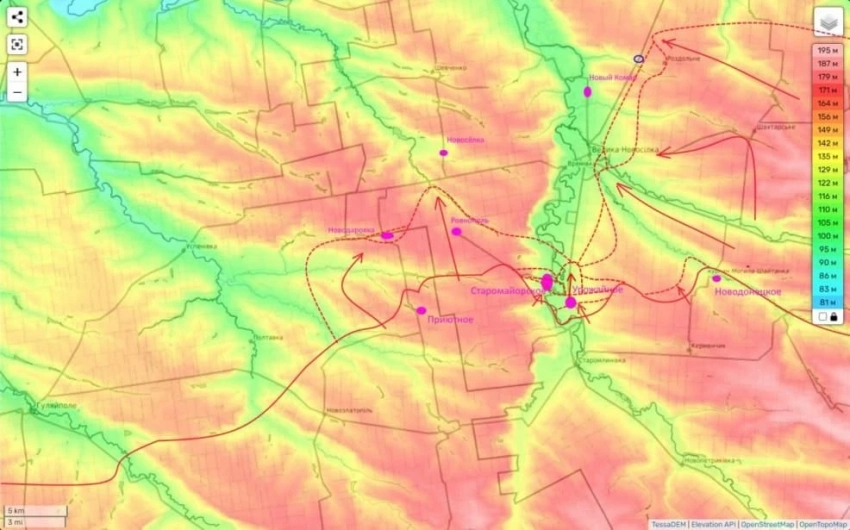 Одновременно с этим продолжается его обтекание с востока и севера. Вчера полностью было взято под контроль Раздольное и упорные бои идут за опорник западнее этого села, находящийся на трассе Большая Новосёлка-Богатырь.