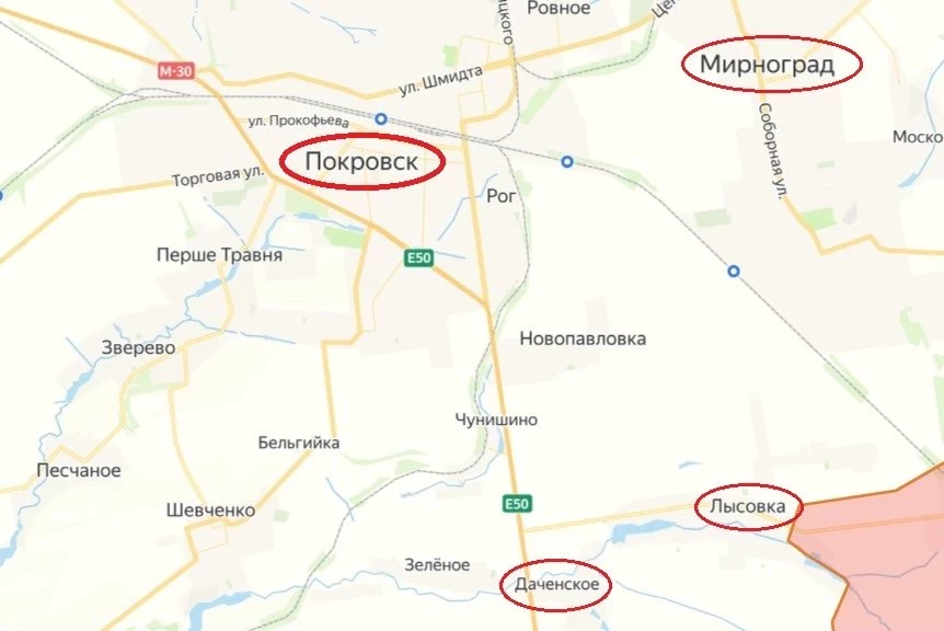 На западе российские войска добились значительных успехов в Лысовке, достигнув южного берега водоема. Освобождение Новогродовки сделало этот населенный пункт стратегически важным узлом обороны для украинских сил, расположенных к югу от Мирнограда. В настоящее время неясно, смогли ли российские штурмовики захватить северную часть села, где сосредоточена более плотная застройка. Продвижение на южном фланге откроет нашим войскам путь к восточным окраинам Даченского, что создаст серьезную угрозу окружения для украинских сил, находящихся в кармане между Лысовкой и Петровкой.