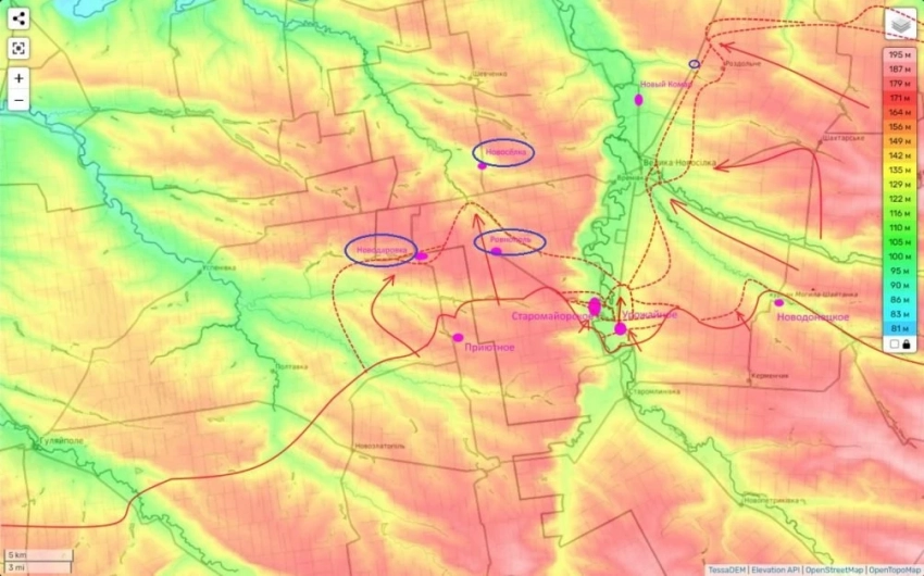 Российские силы пытаются закрепиться в Двуречном и расширить свое присутствие на холме к северо-западу от Новомлынска, где также идут активные бои.