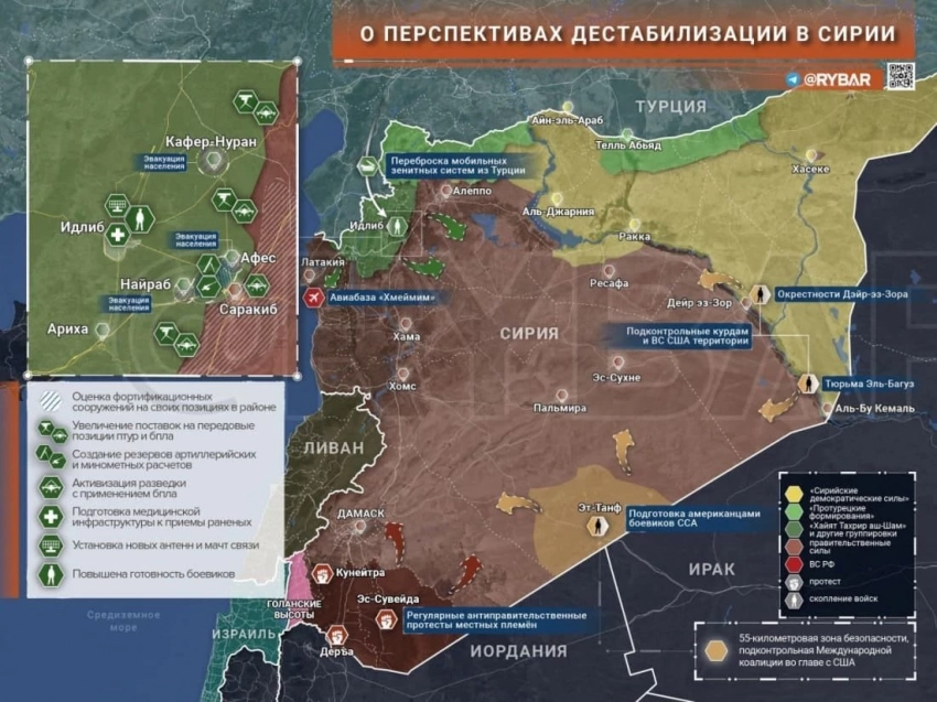 В провинции Идлиб о боях информации не поступало. Это может быть связано с тем, что большая часть региона занята террористической организацией «Хайят Тахрир аш-Шам»* (ХТШ) и другими группировками. Периодически по позициям НВФ в оккупированных городах наносили удары ВКС России и ВВС Сирии.