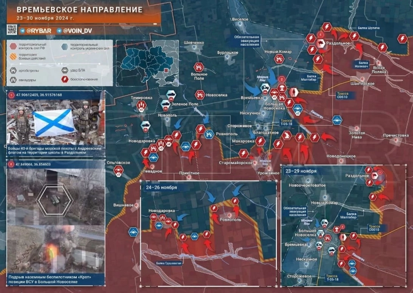 На Угледарском участке наши отбили у ВСУ важную позицию на дороге от Шахтёрского, продвинулись севернее р.Кашлагач и встали широким фронтом на окраине Великой Новосёлки - копят силы и готовят штурм. Южнее ВС РФ закрепляет успех в Раздольном и намерены с запада, через Ровнополь и Новодаровку, взять под контроль часть трассы на Гуляйполе. Маневр создаст котел для ВСУ в этом районе, отрезав их силы южнее Великой Новсоселки. Севернее Ясной Поляны ВС РФ атакуют по направлению к Разливу, до него менее 4 км. Цель - выйти на Константинополь и взять под огневой контроль участок трассы Н15. Наши чуть продвинулись к Сухим Ялам, западнее бьются за Константинопольское, расширяют зону контроля западнее Трудового, давят от Дальнего к Успеновке, в районе Анновки, Романовки и Весёлого Гая. И Елизаветовки и леса рядом ВСУ в спешном порядке выводят остатки сил. Активные бои в Курахово, где под контролем наших войск почти весь центр, включая ~70% многоэтажек. Наш флаг поднят на здании школы.