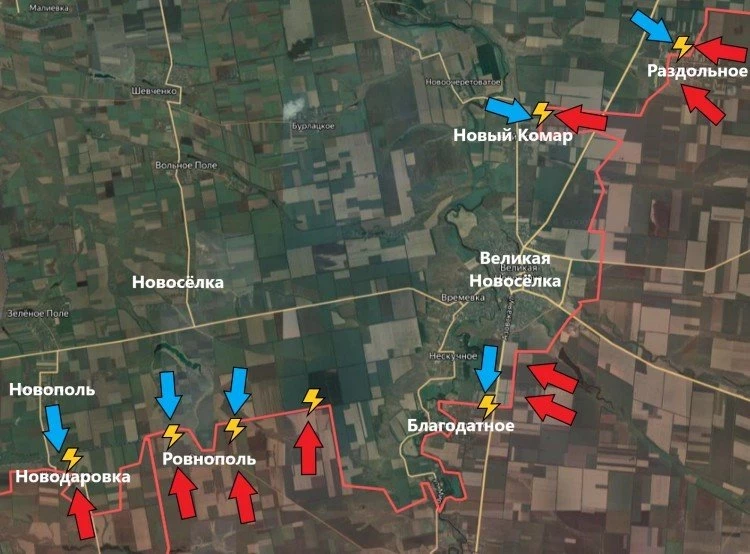 На Великоновосёлковском направлении сейчас оперативная пауза. Наши бойцы отражают попытки врага оттеснить Армию России от Великой Новосёлки и окрестностей. За несколько последних дней существенных изменений зафиксировано не было.