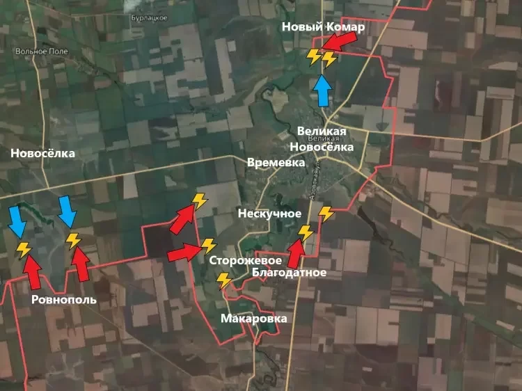 На Великоновосёлковском направлении подразделения ВС РФ высадили дополнительный десант в Новый Комар. Враг жалуется на то, что теперь наши бойцы уверенно контролируют южную часть села и выбить их оттуда не удаётся.