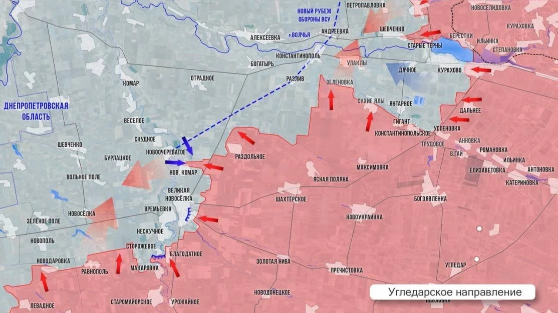 На Угледарском фронте в районе Великой Новосёлки ВС РФ с двух сторон давят в направлении этого села и двигаются к дороге на Гуляйполе. На юге от посёлка идут бои в Сторожевом, а также западнее и юго-западнее. ВКС бьют по району Темировки. Восточнее Великой Новосёлки после ликвидации «кармана» по р.Сухие Ялы и прорыва обороны в районе Зеленовки ВС РФ стараются замкнуть кураховский котёл в районе Константинополь-Улаклы. До последнего остается менее 1,5 км. На днях армия России изолировала этот район с севера, уничтожив мост между Андреевкой и Константинополем, а также маршрут через Старые Терны. Для обеспечения южного фланга наши продвигаются к Разливу и Отрадному. Противник пока оказывает сопротивление в Янтарном и Дачном. В Курахово идут городские бои южнее промзоны ТЭС. По сообщениям с мест, во время зачистки были уничтожены польские наёмники.