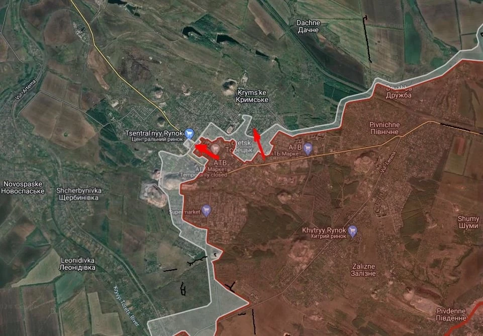 На Торецком направлении российские войска расширили контроль территории в центральной части Торецка, а также давят в направлении шахты «Торецкая» в северо-западной части города.