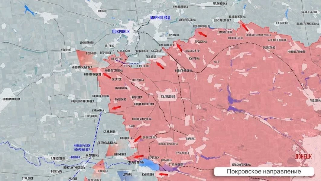 На Покровском направлении ВС РФ наносят удары по обороне противника вокруг Покровска. Довольно большое продвижение было между Песчаным и Волково. Чуть южнее российские части продвинулись к линии обороны между Новоалександровкой и Надеждинкой, обойдя южнее Нововасилевку и Успеновку. Этот маневр поможет обеспечить дальнейший обход юго-западнее Покровска в сторону Удачного и Котлино. Восточнее наши штурмовики формируют плацдарм на левом берегу р. Казенный Торец, откуда можно начать наступление на Миролюбовку и далее на Новоэкономическое. Это позволит перерезать дорогу на Константиновку и продолжить охват Мирнограда с востока. Немного южнее сообщают о выходе наших со стороны Украинки к Ясеневому с севера и востока. После освобождения этого села наша армия сможет ударить в тыл позициям ВСУ по линии Славянка-Петропавловка-Шевченко, которую они пока успешно удерживают.