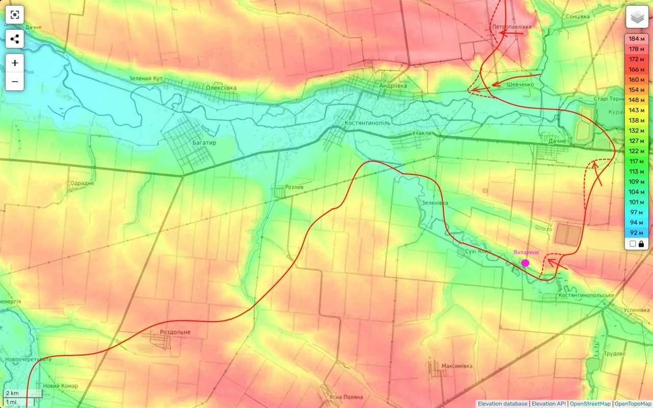 Ключевым объектом в районе Славянки можно считать автомобильную дорогу, соединяющую Покровск с селом Константинополь. Несколько участков этой дороги уже перешли под контроль ВС РФ. Теперь появляется возможность увеличить протяжённость участка контроля с последующим выходом к Константинополю с севера.