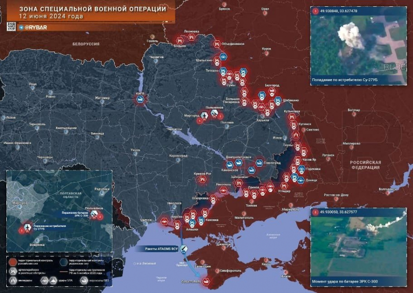 В течение суток российские войска нанесли серию ударов по объектам противника на территории т.н. Украины, в том числе в Полтавской и Днепропетровской областях. В Сети появились кадры поражения Су-27УБ на аэродроме Миргород и батареи ЗРС С-300 к востоку от него. В свою очередь, ВСУ вновь произвели пуск 12 оперативно-тактических ракет ATACMS по Крымскому полуострову.