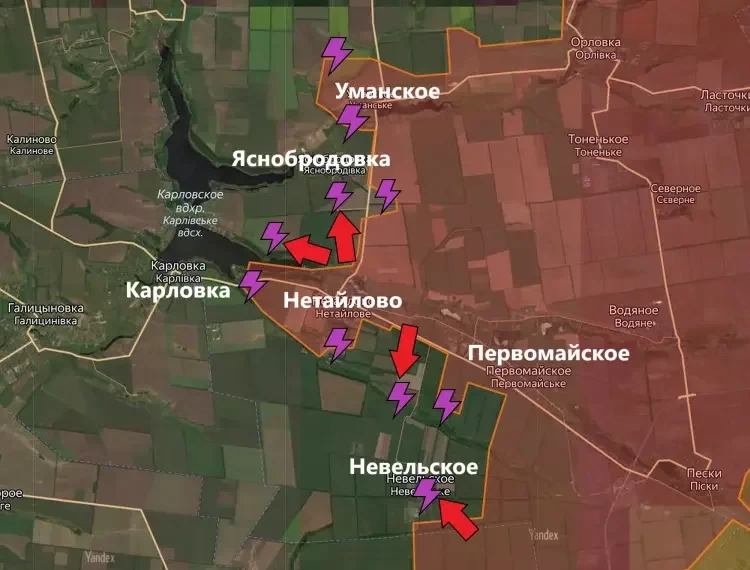 Также сообщается о боях у Новоалександровки, Евгеньевки, Новоселовки Первой. Чуть южнее Вооруженные силы Российской Федерации (ВС РФ) наступают у Нетайлового, Георгиевки, Парасковеевки и «проявляют наибольшую активность» у Красногоровки, ситуация у которой в сводке названа напряженной.