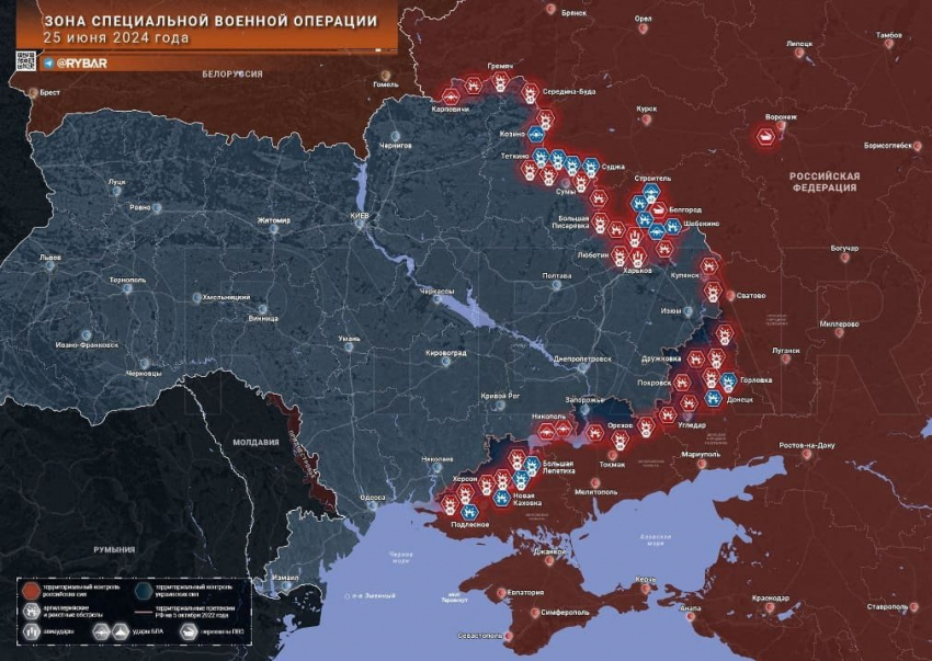 Сводки с различных направлений в зоне СВО, а также карты боевых действий на Украине на среду, 26 июня 2024 года. На Украине не стихают боевые действия, в ходе которых российская армия стремится добиться полной демилитаризации и денацификации киевского режима.