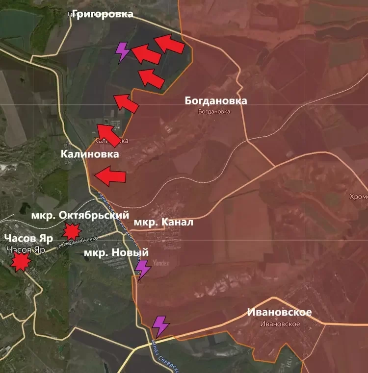 На Часовоярском направлении продолжаются бои в восточной части Часов Яра. Также, российские войска продолжают улучшать свои позиции по флангам. Активно работаю средства дальнего поражения. Об этом пишет Telegram-канал Wargonzo.