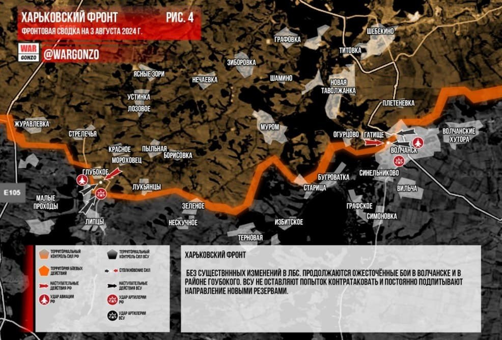 Обновлённая карта боевых действий на Украине по данным на 12:00 мск сегодня, 03.08.2024