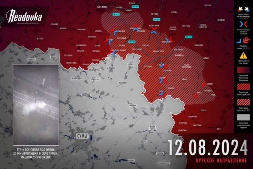 Однако главным событием стала попытка прорыва границы России сразу на двух новых участках. Утром в окрестностях села Гирьи Беловского района Курской области местные жители заметили колонну украинской бронетехники, которая вскоре была сожжена. Подобная участь ждала и «вторженцев» под Колотиловкой Краснояружского района Белгородской области.