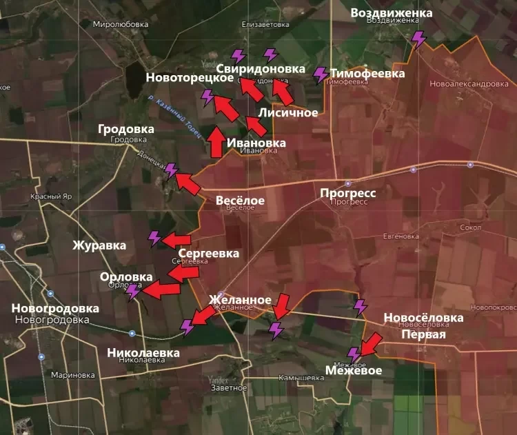 На Покровском направлении начались бои в жилой застройке Гродовки. Наши парни выбили ВСУ из опорных пунктов юго-восточнее и северо-восточнее села, благодаря чему линия фронта выровнялась. Со стороны освобожденного Желанного российские силы продвинулись вдоль жд-полотна на расстояние примерно в три километра. Также наши бойцы продолжают зачистку Свиридоновки. Помимо этого российская армия взяла Орловку и половину соседней Журавки, сообщает в Telegram-канале военкор Евгений Лисицын.