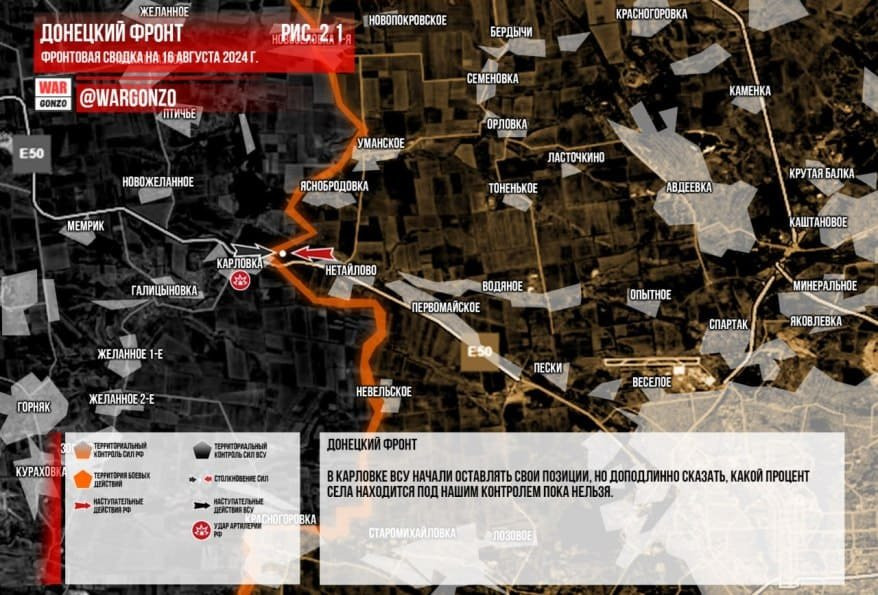 Обновлённая карта боевых действий на Украине по данным на 12:00 мск сегодня, 16.08.2024