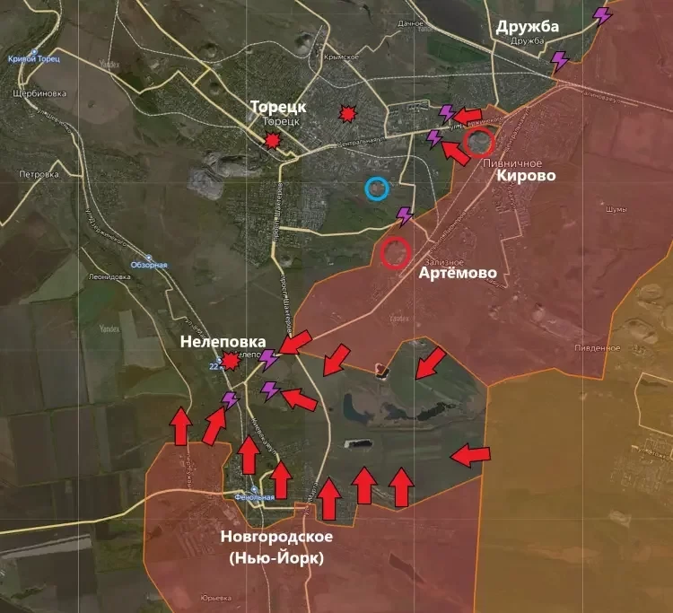 На Торецком направлении идет зачистка окраин населенного пункта Артёмово, который находится под полным контролем ВС РФ. Со стороны Кирово и террикона шахты «Северная» российские войска наступают в направлении многоэтажных зданий в Торецке.
