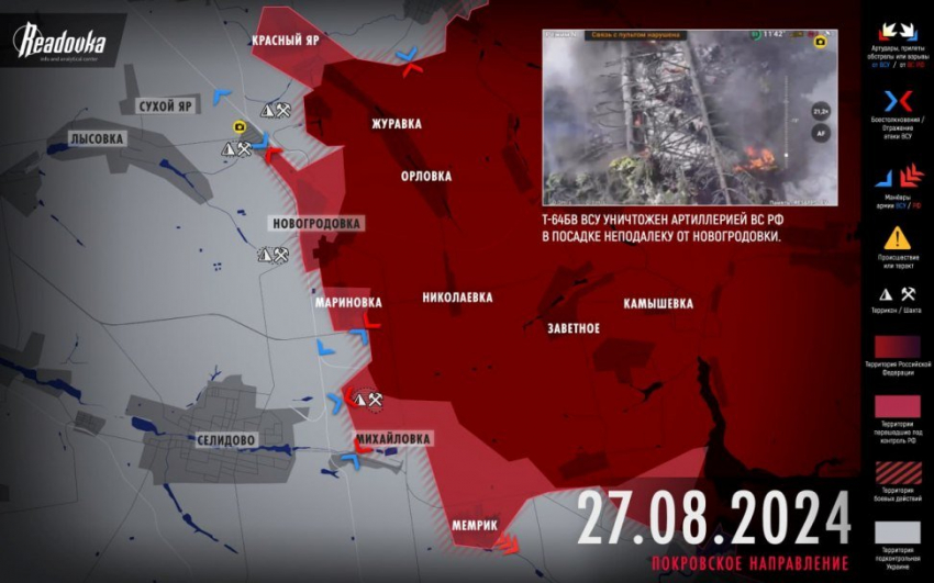 Южнее Новогродовки противник отошел из села Мариновка, за которым начинаются предместья Селидово. Выведенные силы ВСУ использовали для усиления гарнизона этого города. Восточнее Селидово русские войска полностью зачистили Калиново, после чего вошли в село Мемрик. Этим ВС РФ создали прямую угрозу ВСУ в Карловке, которую противник также скоро оставит.