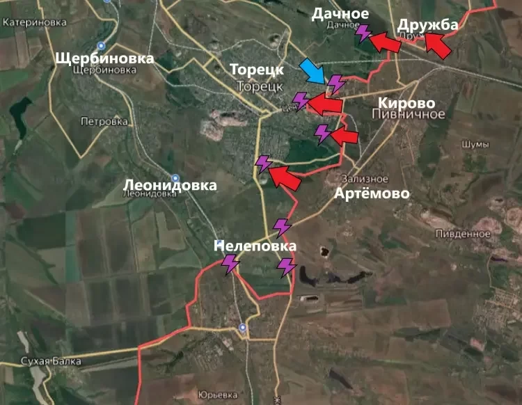 На Торецком направлении продолжаются упорные бои восточной части самого Торецка. Наши медленно, но верно зачищают высотные строения. Российские бойцы уверенно дозачищают крайние улица поселка Дружба, а также продвигаются со стороны бывшего Нью Йорке (а теперь Новгородского) в сторону Пантелеймоновки. Об этом в Telegram-канале сообщает военкор Евгений Лисицын.