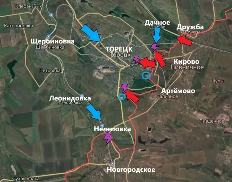 На Торецком направлении на северном фланге наши бойцы пытаются продвинуться в сторону Дачного. Тем временем из самого Дачного враг атакует подразделения ВС РФ в Торецке (Дзержинске). Штурм города продолжается, однако серьёзных успехов в продвижении за последние сутки не наблюдается. Враг перебросил в Торецк резервы и не только обороняется, но и контратакует. В южной части Торецка продвижения также нет - существенно мешает враг, занимающий небольшой террикон.