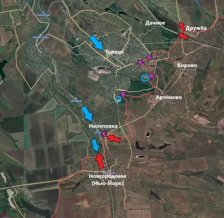 Торецкое направление. Противник был выбит с территории шахты Новая. Был взят примыкающий к ней террикон, который дает нам преимущество при штурме города. Всесте с этим российские войска двигаются на северной окраине Торецка от Дружбы к Дачному.