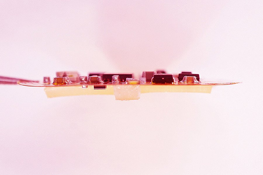 Они создали устройство из трех компонентов. Каркас представляет собой тонкую гибкую электронную схему с датчиками. На него нанесен ультрамягкий гель, созданный из крахмала тапиоки и желатина, который имитирует структуру самой ткани. Наконец, в гель помещаются микробы S. epidermidis.