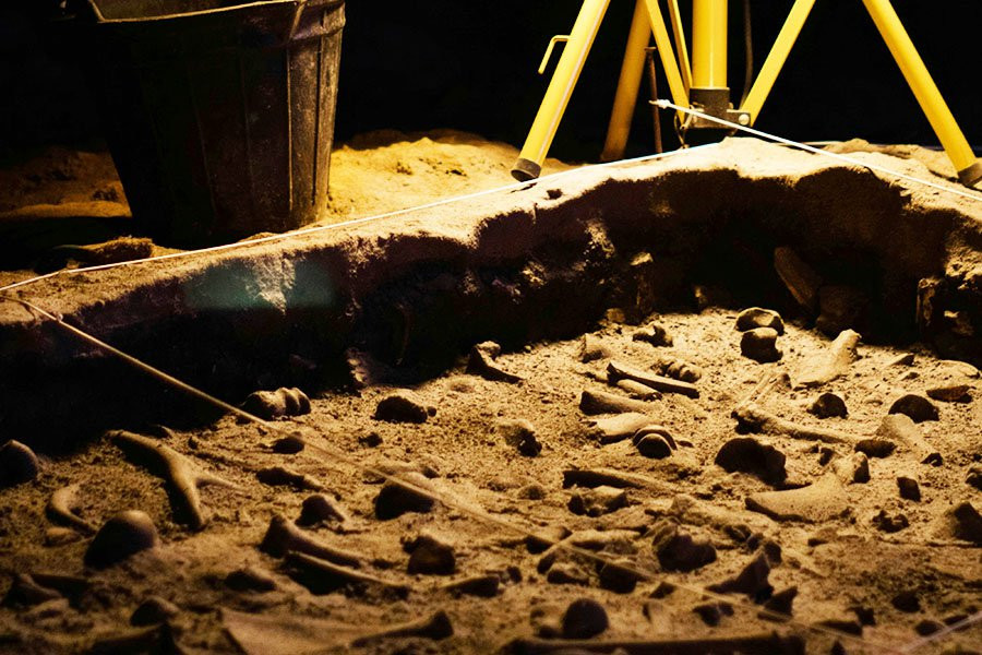 Было обнаружено, что камень недавно упал со скалистого склона в части Западной Сибири вдоль реки Кия из-за естественной эрозии. Из него торчали окаменелые кости, раскрывая его древнюю историю.