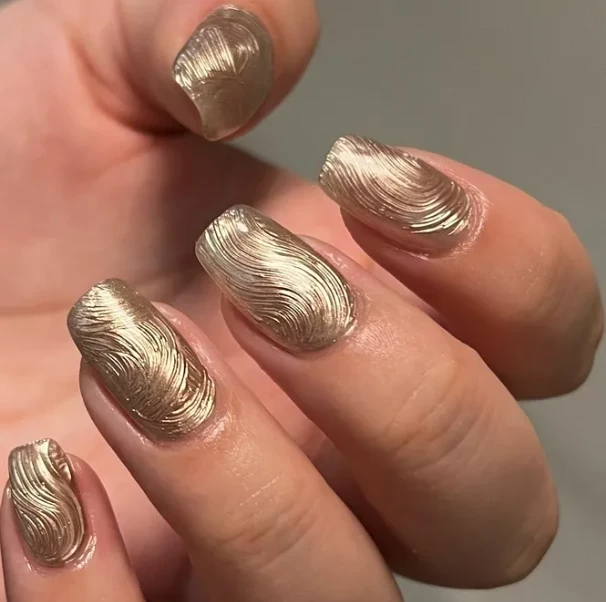 Для любителей абстракции золотые мазки на темном фоне — это идеальный выбор. Создание текстуры с помощью широкой кисти по золотому покрытию превращает маникюр в настоящее произведение искусства. Золотые акценты будут сиять на ногтях, привлекая внимание и придавая рукам особое очарование. Такой маникюр станет незаменимым украшением в любом праздничном образе.