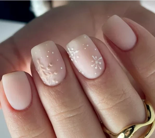 Для коротких ногтей идеально подойдут матовые покрытия с пушистыми снежинками – просто и элегантно.