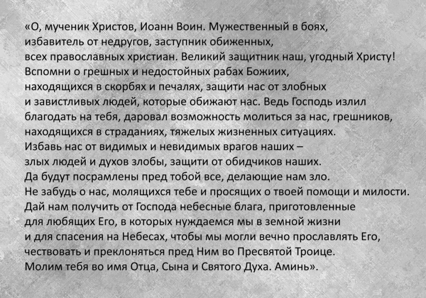 Иоанн Воин особенно почитается среди военных и тех, кто служит своему отечеству. Родственники и сами воины могут обращаться к святому за заступничеством, чтобы избежать гибели и увечий. Святой также поддерживает несправедливо обвиненных и заключенных, поскольку сам пережил подобные испытания, об этом сообщает сайт katerworld.ru.